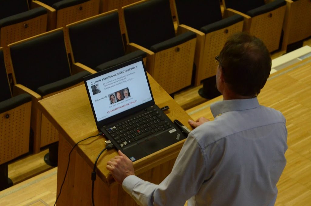 A kvantummechanika talán legmegdöbbentőbb jóslata egy furcsa távolhatás. Ugyan Einstein a kvantummechanikában elért eredményeiért kapott Nobel-díjat, de nem tudta ezt a távolhatást elfogadni… Ezért a kvantumelméletet nem gondolta „teljesnek”. Szerencsére nem volt igaza. Ma ezért létezik kvantumtechnológia. Erről szól az előadás, de arra is kitérünk, hogy létezik-e rend egy kvantumkönyvtárban, és hogy ennek mi köze Neumann Jánoshoz, illetve hogy milyen a kvantumos „itt a piros, hol a piros”.